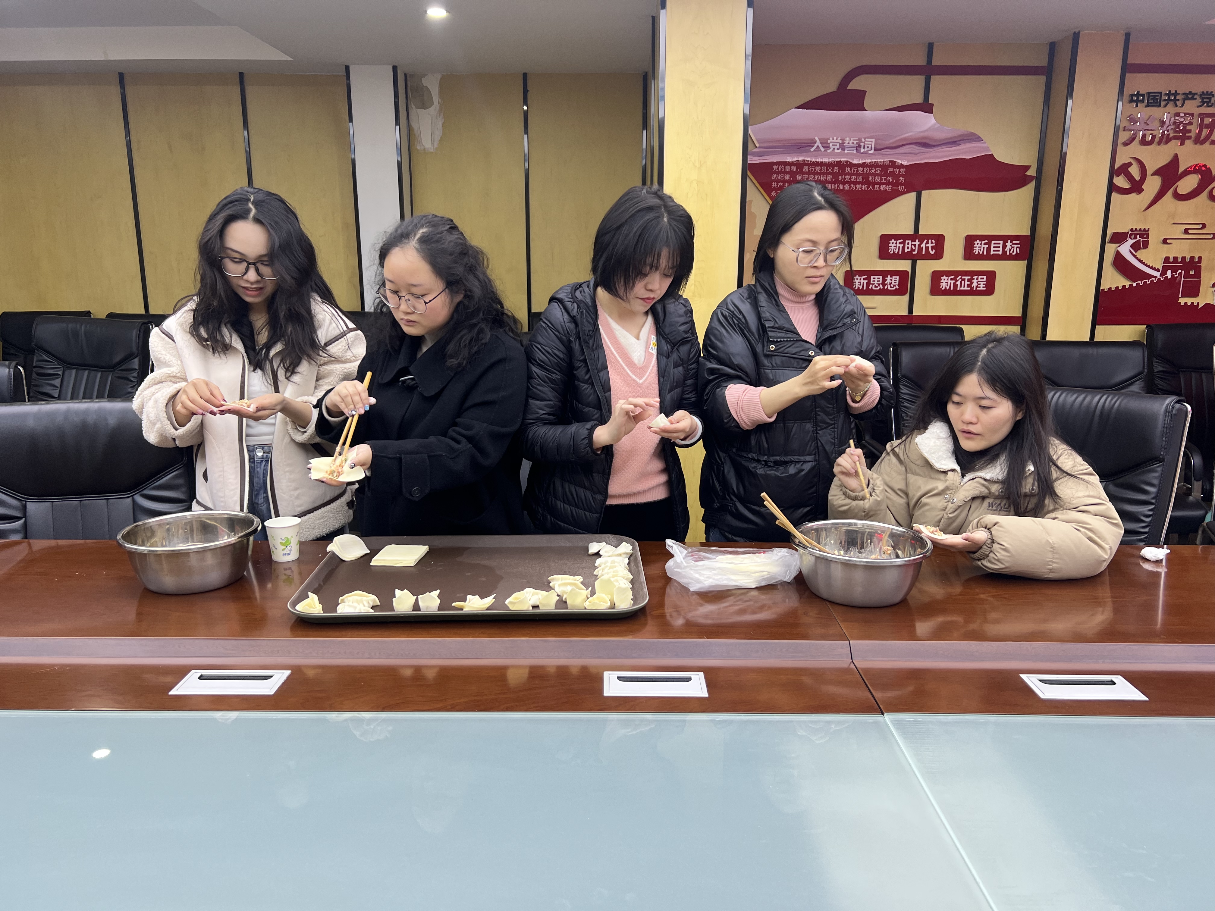 分会场——中部业务区开展了趣味十足的包饺子活动,活动现场,女工们热情高涨。和面、洗菜、剁馅……大家忙得不亦乐乎。在包饺子过程中,大家各显神通,各施创意。在女工们的巧手中,饺子被包成“元宝形”“月牙形”“三角形”“圆肚形”“花朵形”等等。一个个独具特色,形态各异的饺子充分展现出女工们的智慧和艺术,赢得前来现场“凑热闹”观摩的男员工们的一阵阵掌声和喝彩声,“色香味型俱全”,男员工们一边品论着,一边津津有味地品尝起女同事们的劳动成果。女工们脸上个个露出了收获的成就感,大家纷纷用手机拍照留念,现场一片欢声笑语。